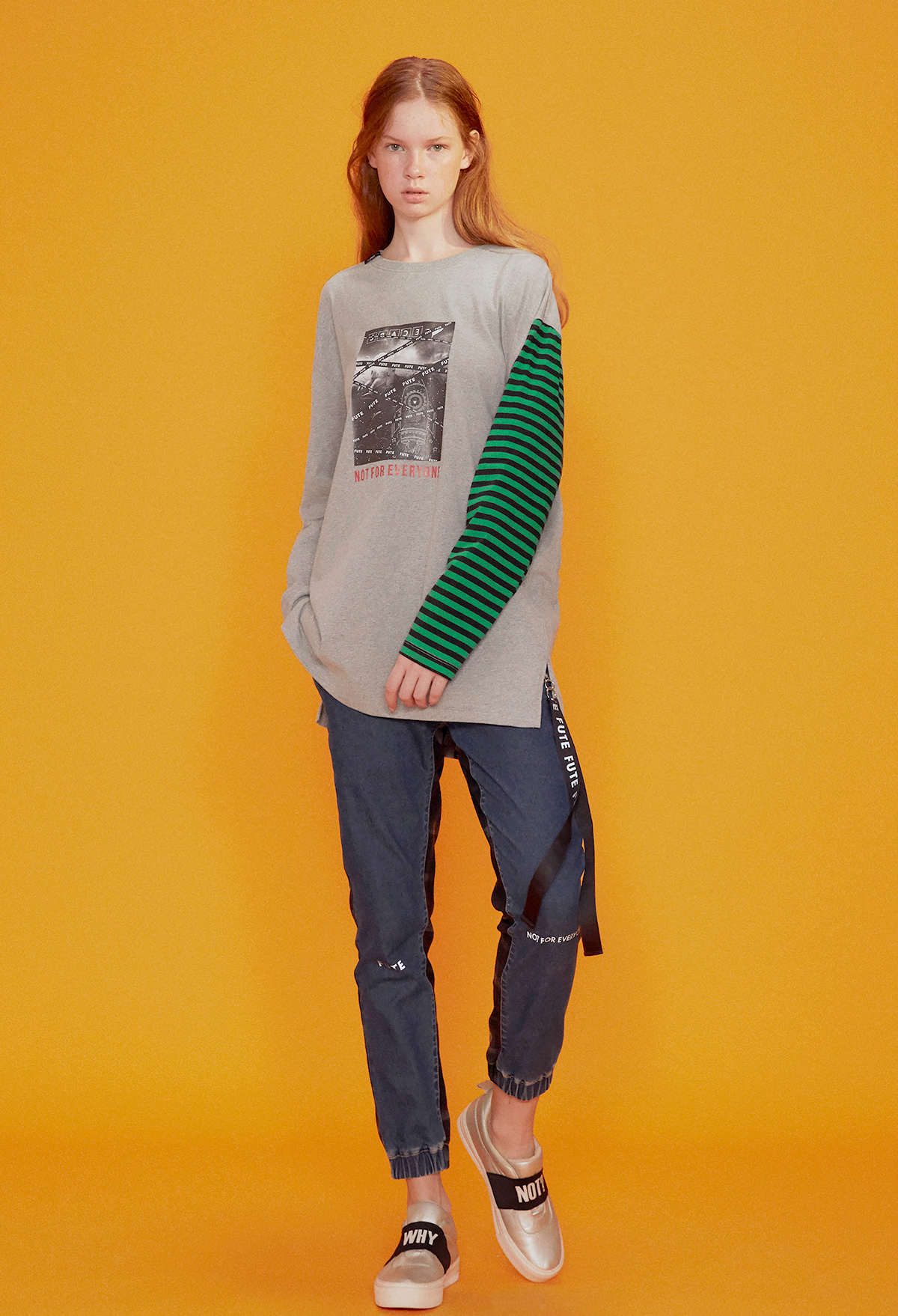 - 左袖撞色條紋布拼接。