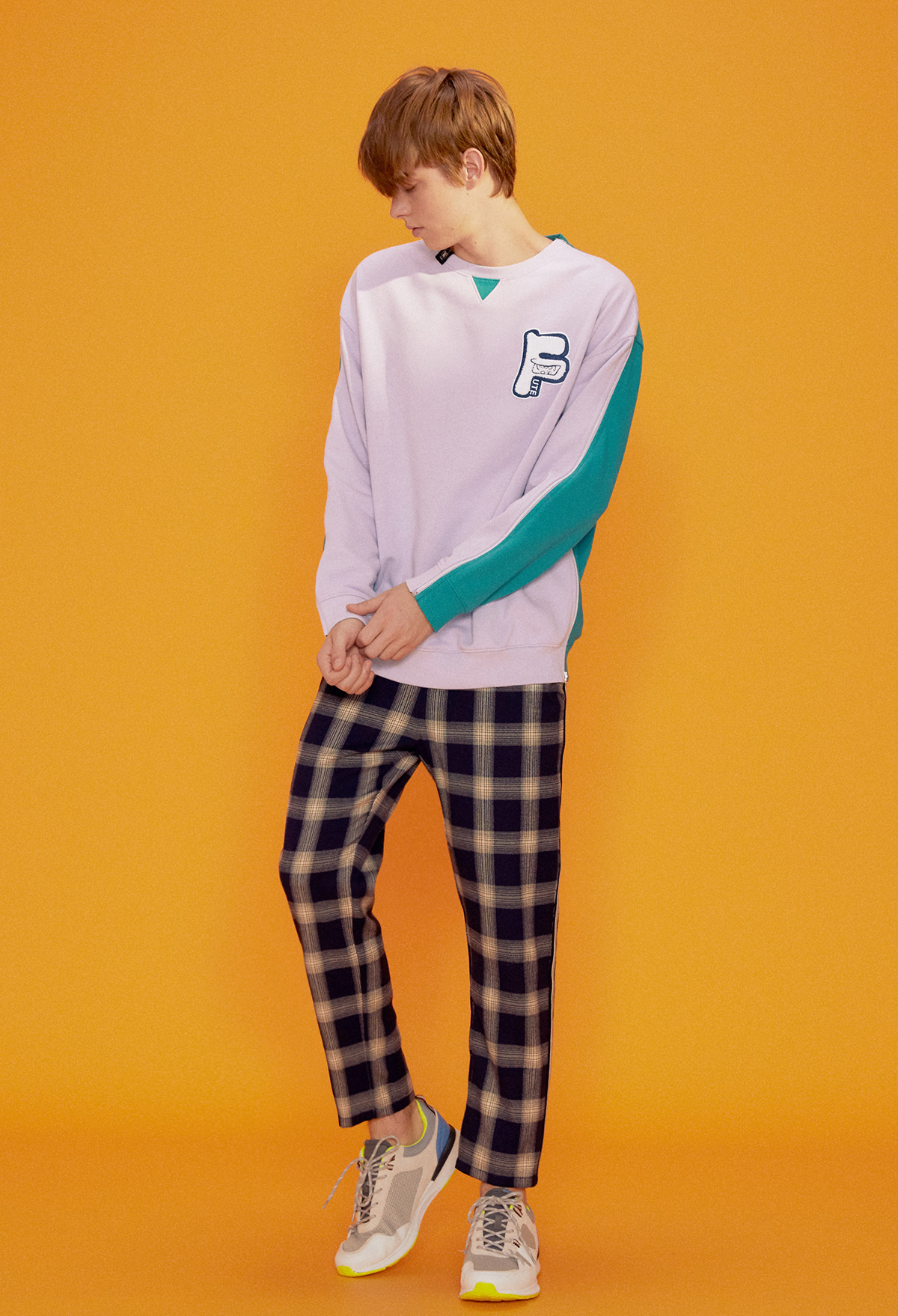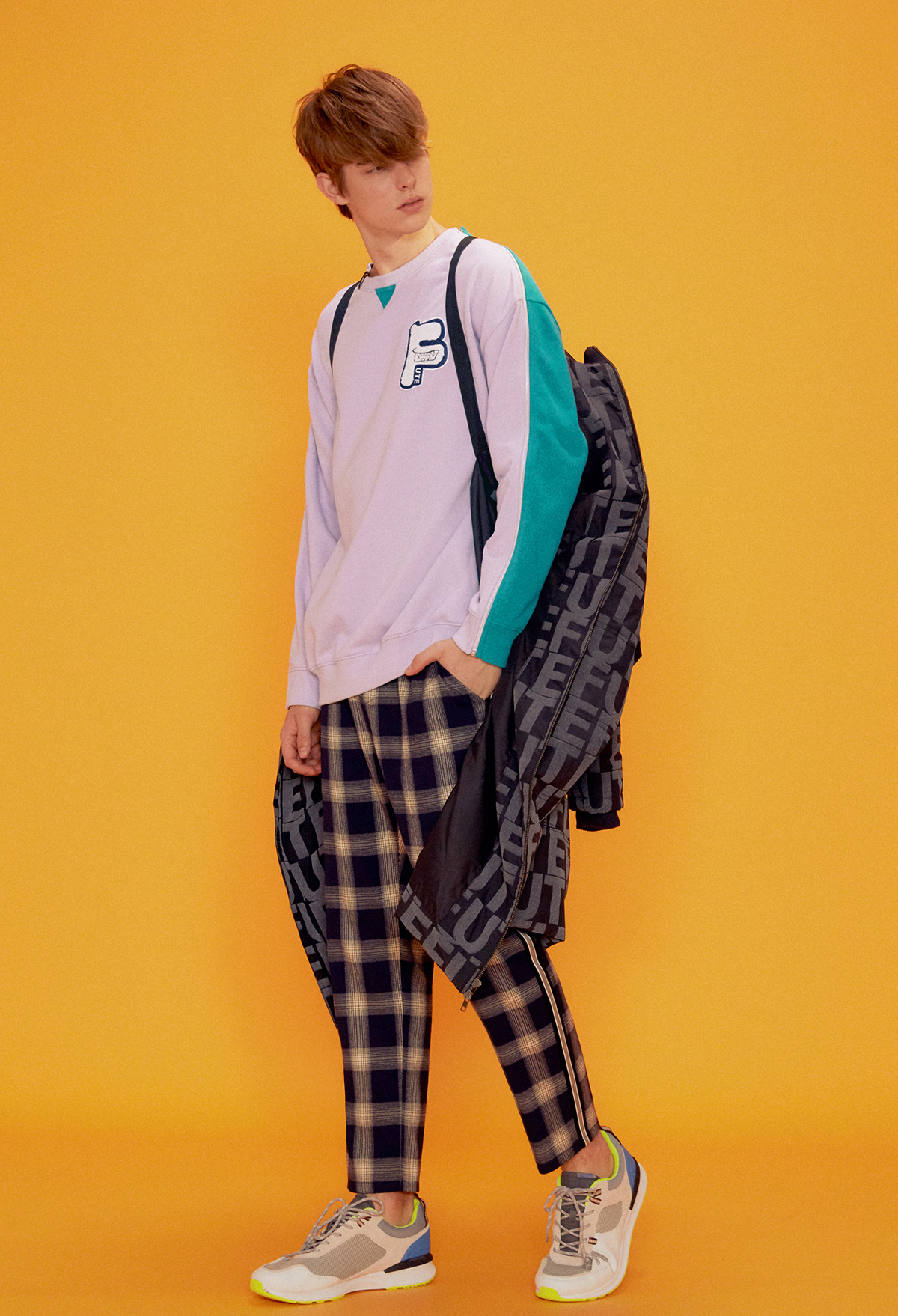 - 左胸 "F"造型毛巾繡PATCH裝飾。