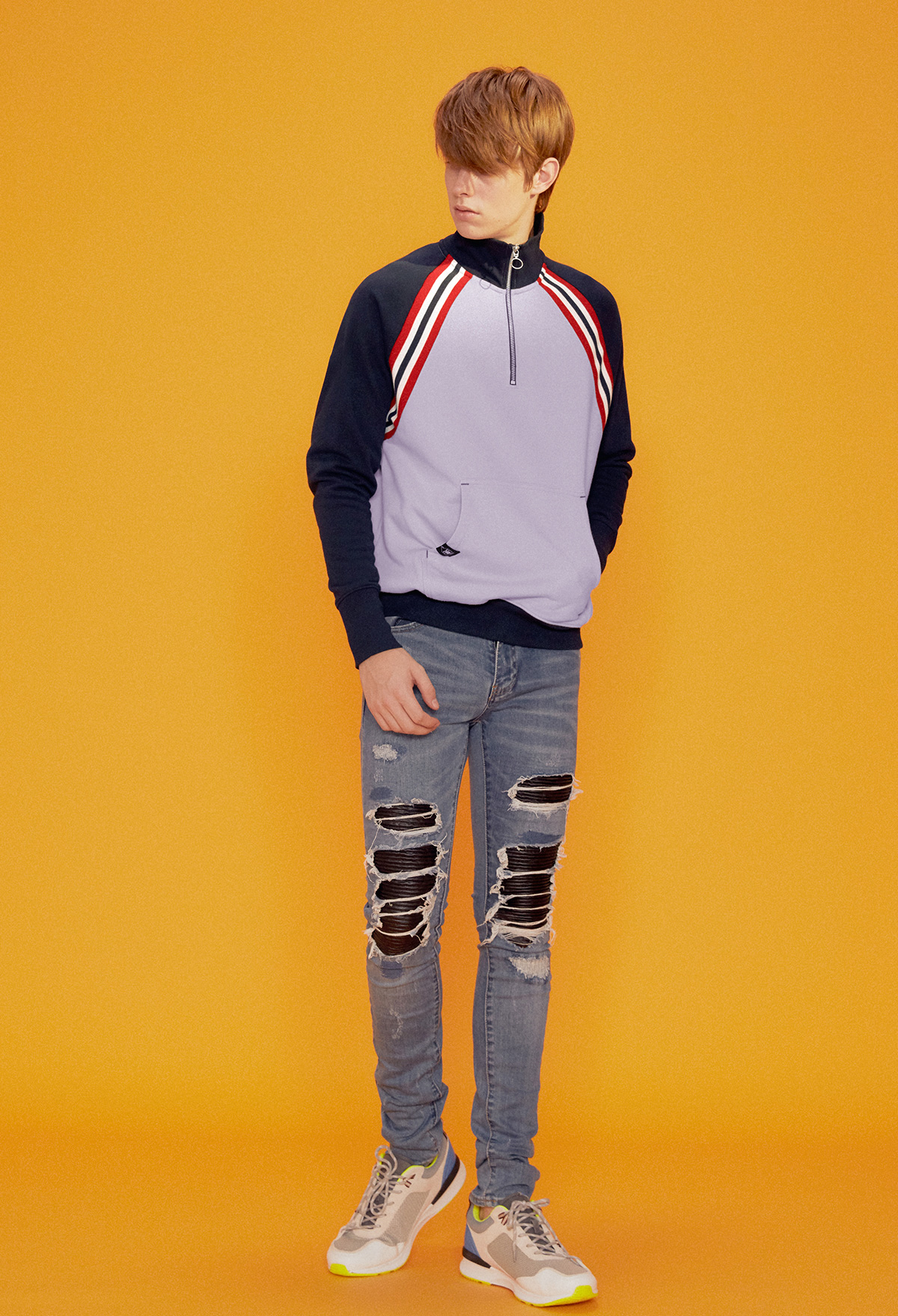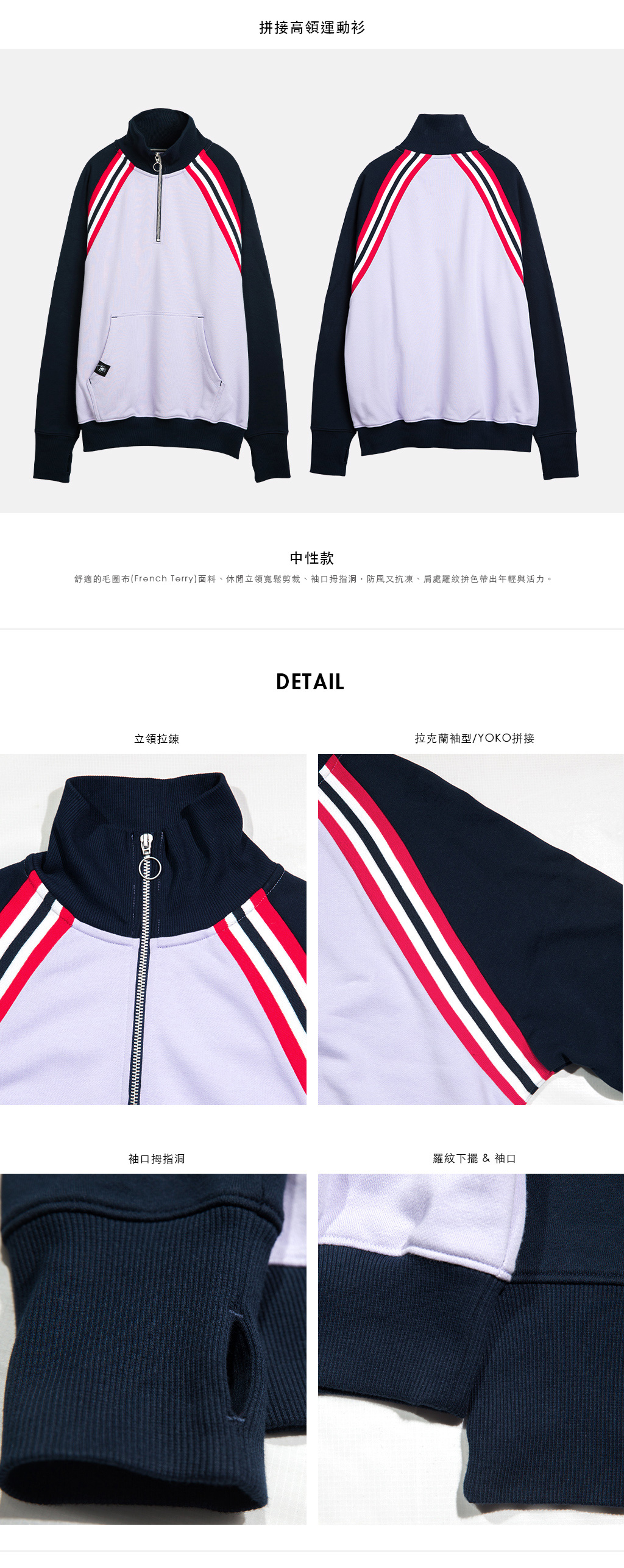 【中性款】拼接高領運動衫/粉紫