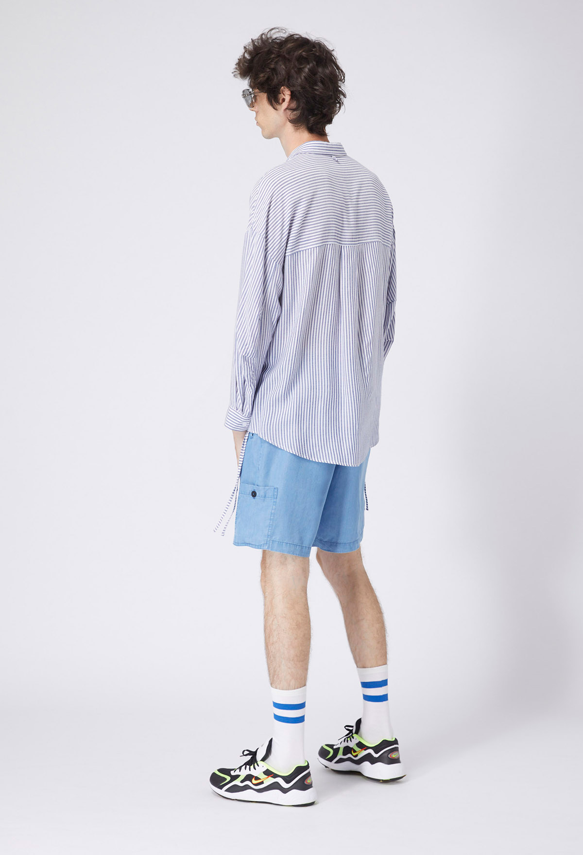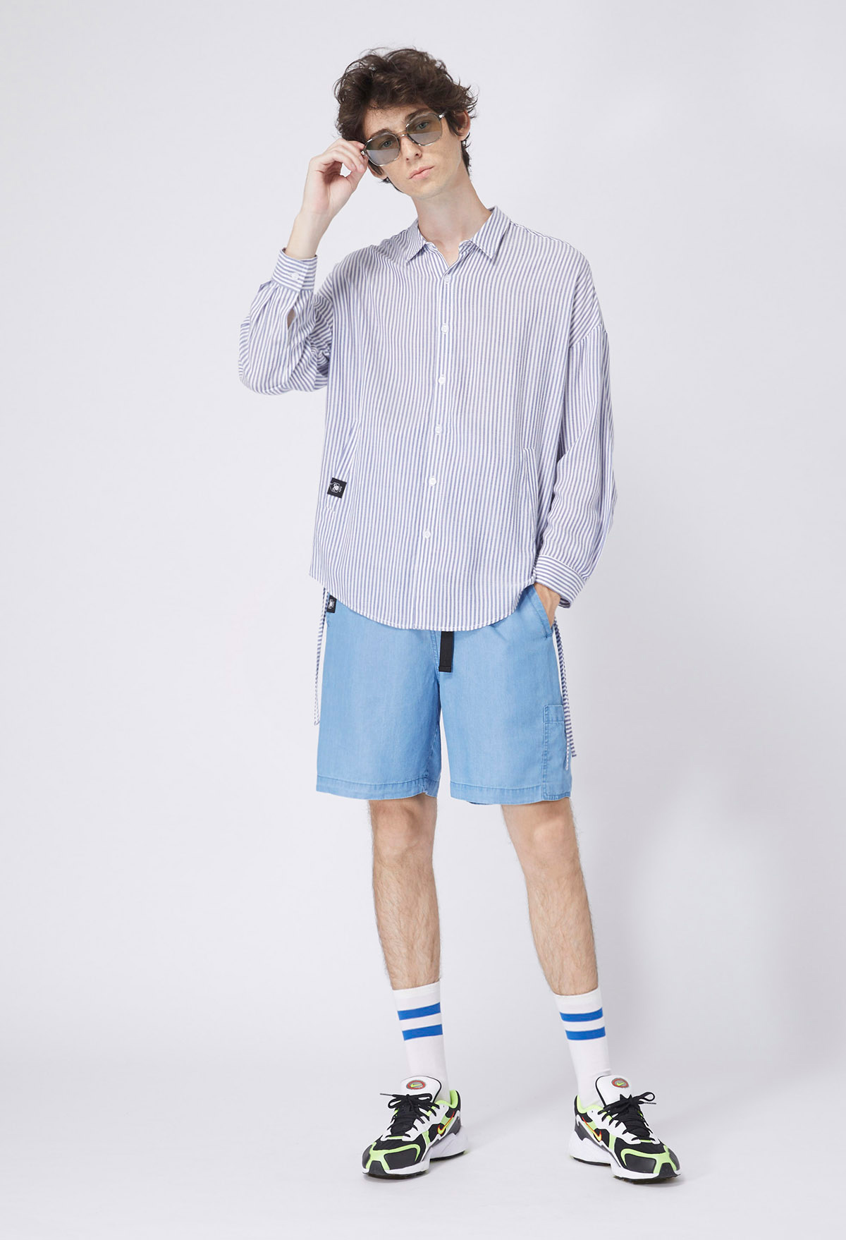【中性款】 側邊抽繩設計襯衫/深藍白條紋