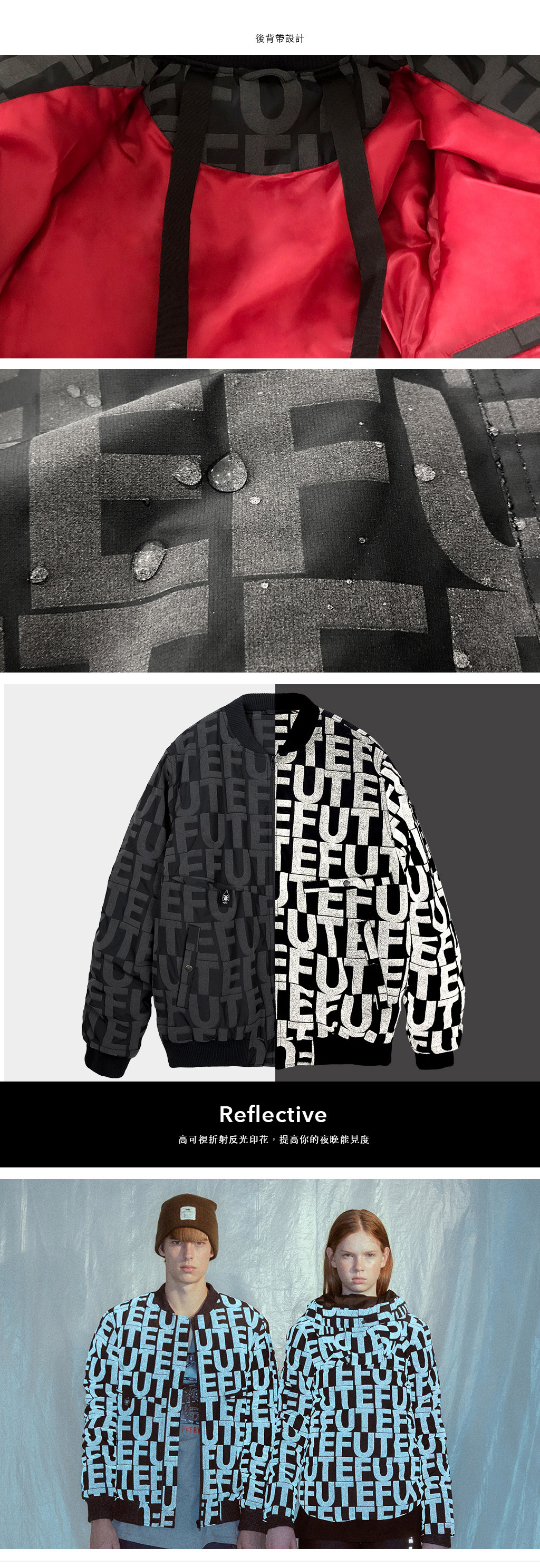 – 防撥水LOGO反光印花面料。