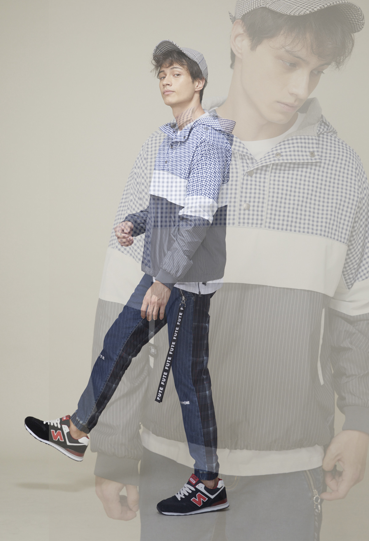 【中性款】套頭連帽拼接上衣/深藍拼接色